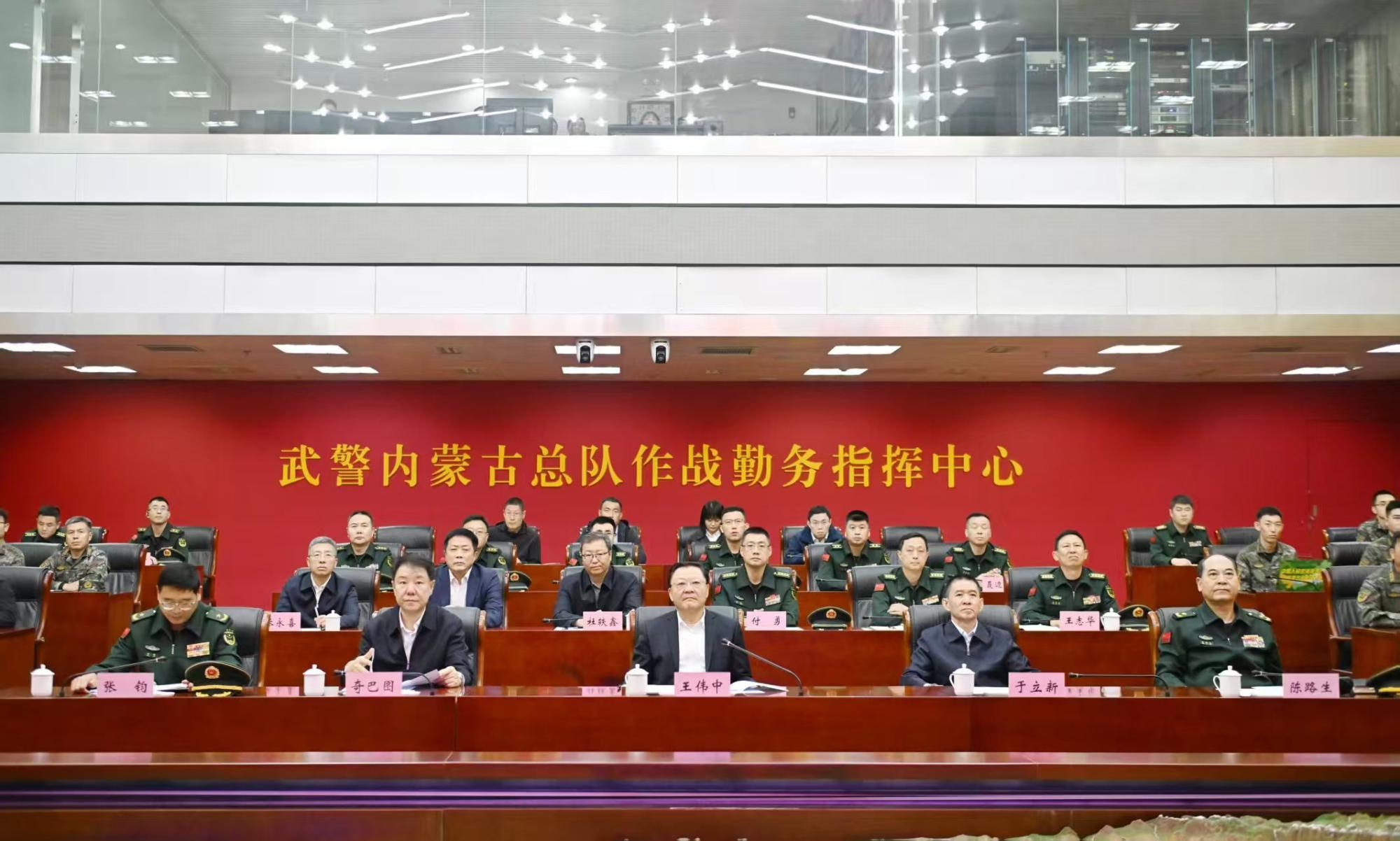 在武警內(nèi)蒙古總隊(duì),王偉中來到作戰(zhàn)勤務(wù)指揮中心,仔細(xì)聽取部隊(duì)建設(shè)和指揮中心運(yùn)行情況介紹。他指出,武警內(nèi)蒙古總隊(duì)是一支有著光榮歷史的英雄部隊(duì),希望部隊(duì)繼續(xù)關(guān)心支持自治區(qū)經(jīng)濟(jì)社會(huì)發(fā)展,加強(qiáng)練兵備戰(zhàn),做好應(yīng)急準(zhǔn)備,當(dāng)好內(nèi)蒙古高質(zhì)量發(fā)展和長治久安的堅(jiān)強(qiáng)基石、忠誠衛(wèi)士,為全區(qū)社會(huì)大局穩(wěn)定和人民群眾安居樂業(yè)保駕護(hù)航。