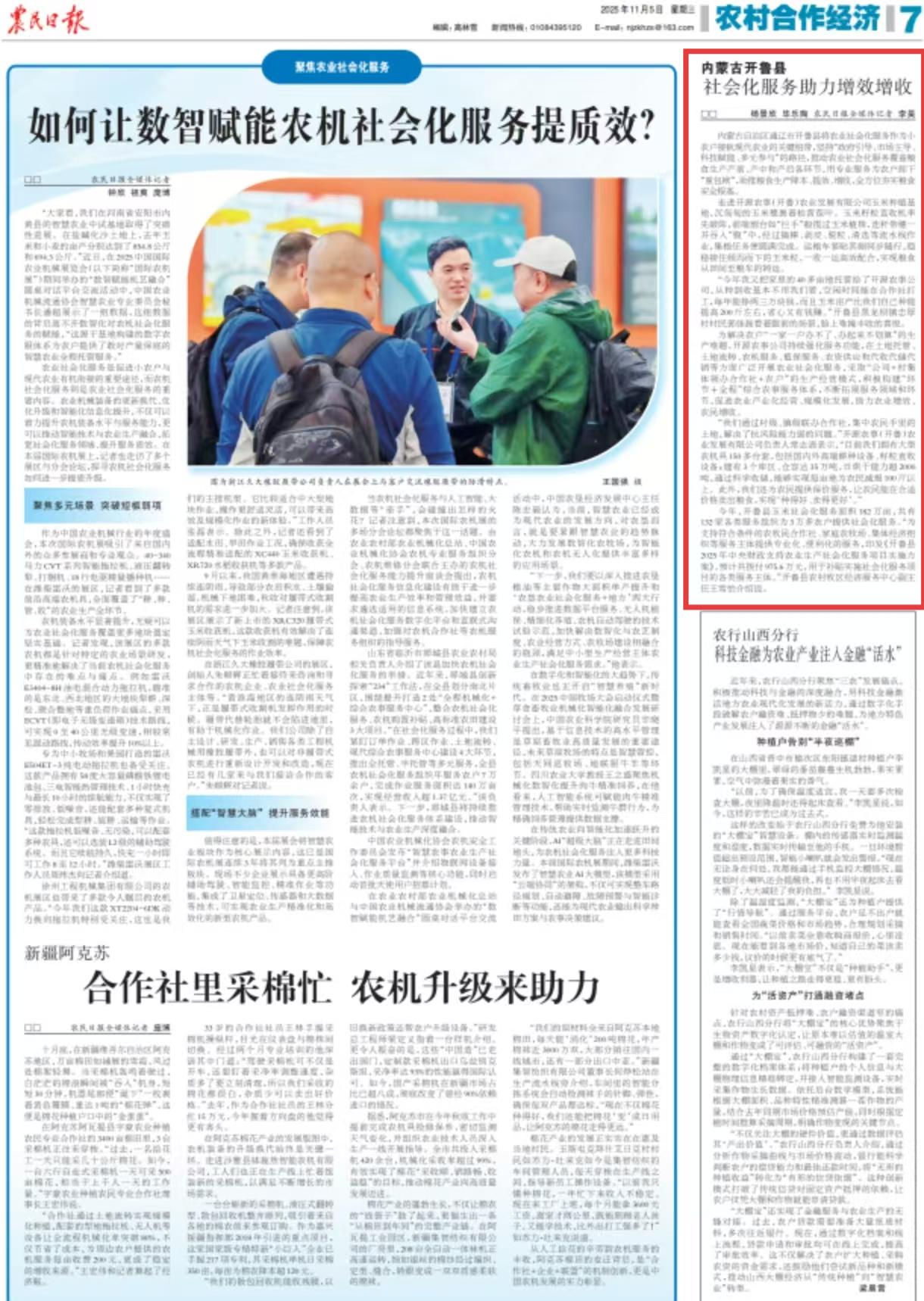 2025年11月5日,《農(nóng)民日?qǐng)?bào)》第7版刊發(fā)題為《內(nèi)蒙古開(kāi)魯縣:社會(huì)化服務(wù)助力增效增收》的文章,報(bào)道了今年以來(lái),內(nèi)蒙古開(kāi)魯縣玉米社會(huì)化服務(wù)面積182萬(wàn)畝,共有132家各類(lèi)服務(wù)組織為3萬(wàn)多農(nóng)戶(hù)提供社會(huì)化服務(wù)。