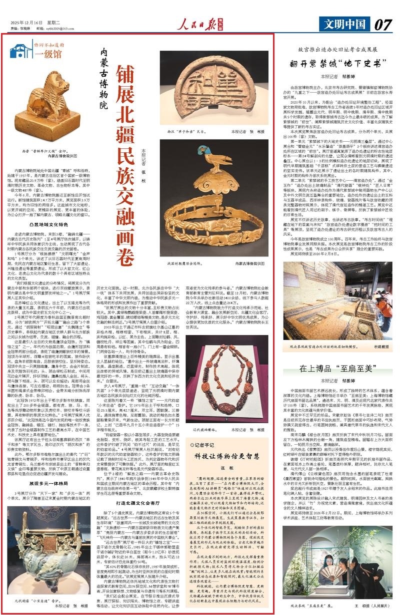12月16日,《人民日?qǐng)?bào)海外版》刊發(fā)《內(nèi)蒙古博物院 鋪展北疆民族交融畫卷》,報(bào)道內(nèi)蒙古自治區(qū)首個(gè)國(guó)家一級(jí)博物館今年6月搬遷至新館后開館試運(yùn)行。新館建筑面積14.7萬(wàn)平方米,展覽面積3.9萬(wàn)平方米,均為舊館的兩倍多。這座城市文化地標(biāo),以更開闊的空間、更精彩的展覽、更豐富的體驗(yàn),為公眾打開一扇了解內(nèi)蒙古、領(lǐng)略北疆文化的窗口。